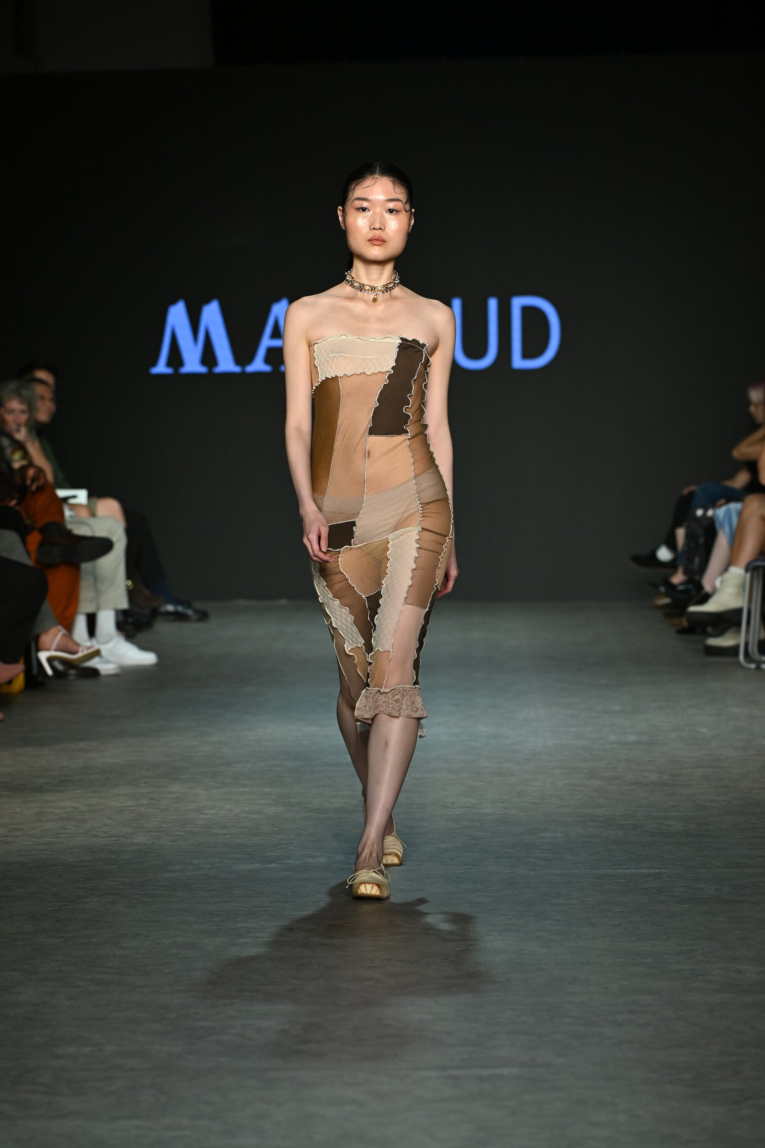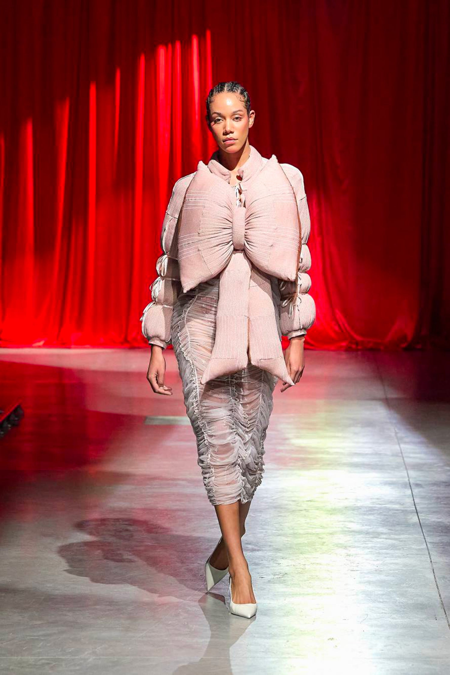 Les silhouettes sculpturales, confectionnées à partir de chaussettes et de collants upcyclés, réinventent les codes classiques avec audace et sensualité, dans une ode à la féminité libre et créative.