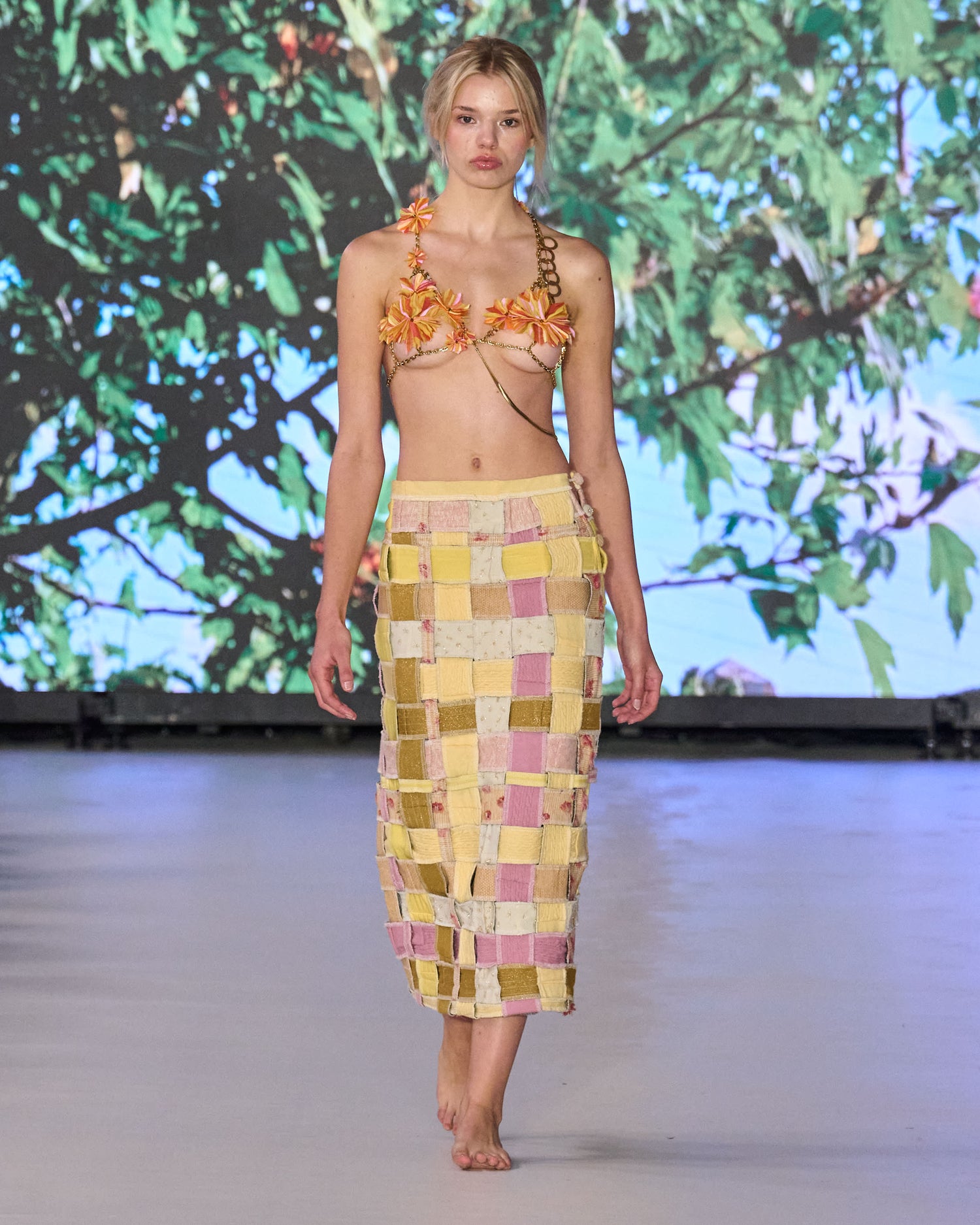 Ensemble, elles ont façonné un univers floral en travaillant les volumes, les motifs et les couleurs avec délicatesse, mêlant des matières inattendues — soie, chaussettes et collants — pour donner naissance à des pièces profondément sensibles.